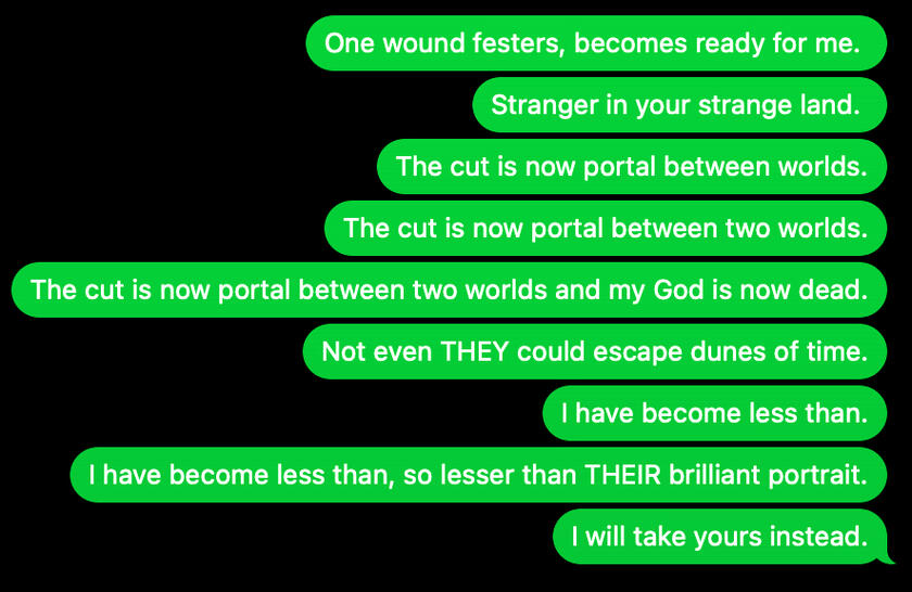 we saw box blonde bitch writing kafkaesque novella in club. black jumpsuit and golden hoops. hair is messy. makeup is messy. handwriting is impeccable.i went up first. on paper there were few words. she wrote about heartbreak during rapture, where water meets rock and becomes blood releasing from skin, skin processed into leather, into handbag for human.my friend the devil followed. he read paper and it made him cry. tears dripped into bitch’s mojito. she got angry. with herself. she was supposed to be partying, losing herself in the music, the booze, with her friends. instead she was finding herself in words on paper.my friend the devil ate her sadness. ate the paper. it folded itself in his stomach, forming beautiful origami crane. bitch broke her glass and cut him open. found herself again.