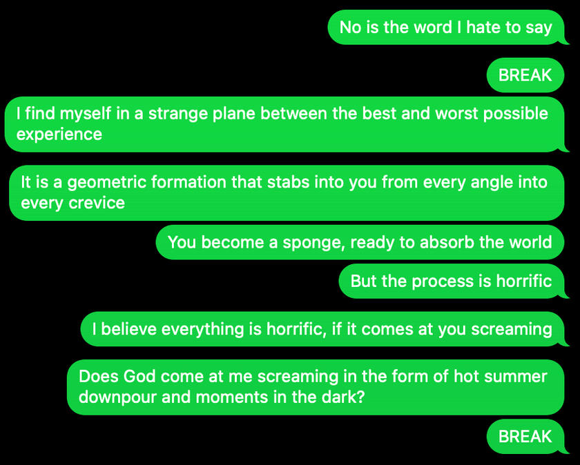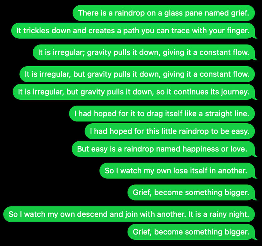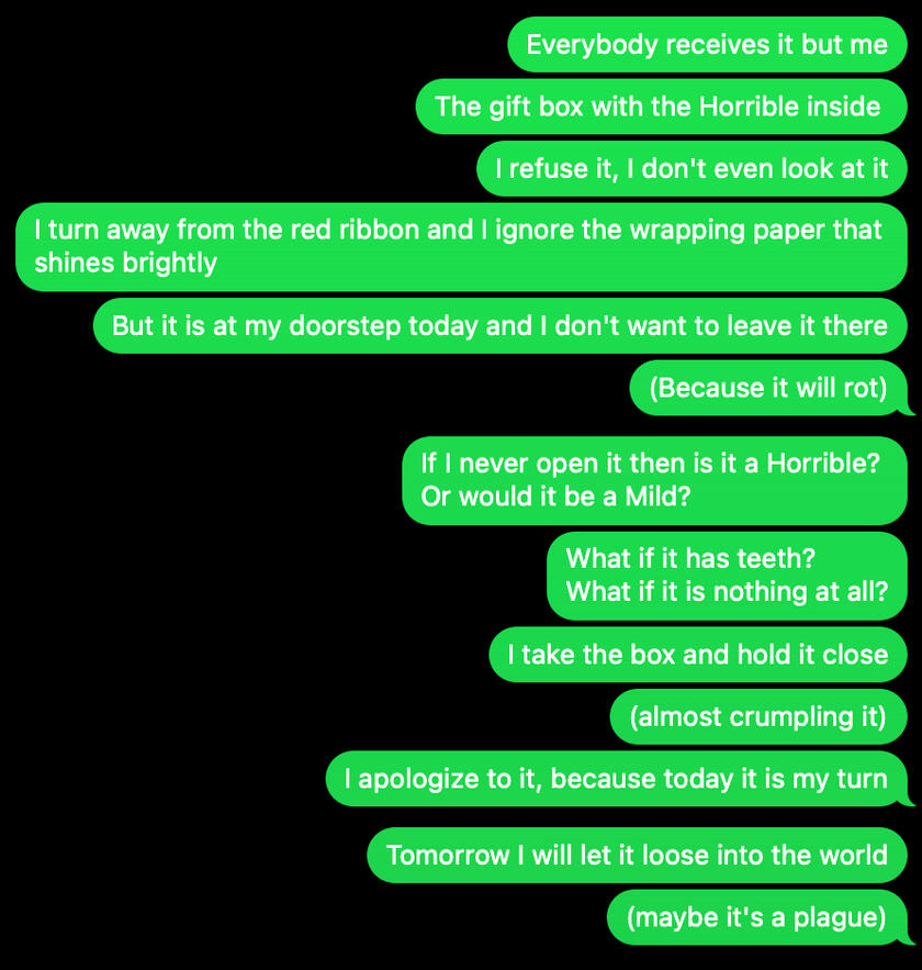 My voice has been stolen and used to say “hello” to terrifying monsters in the dark. The forest houses them. My house is a forest of moss, weeds, and mushrooms. My voice has cracked and crumbled like a marble column, like bad birthday cake.There is no water. There is no rain, no thunder, no anger. But there is something better, in that forest.