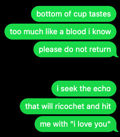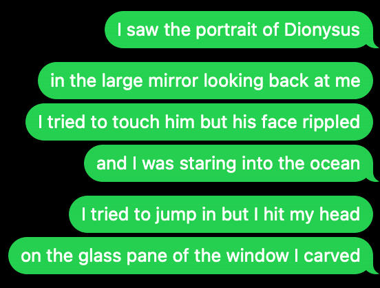 I leave a ball of yarn by the door labeled “abandon” and cross the threshold, holding the string. The hallway winds and twists itself like an excited monster that searches for something horrible. With a heavy heart, I follow the path as the soft light from the entrance bids farewell.I wake up in the Minotaur’s stomach. It flosses its teeth with the string, braids it into its hair. Why does it make itself look pretty? Who is it for? Etched into the stomach walls is an inscription. I begin to read it…I make you a home.