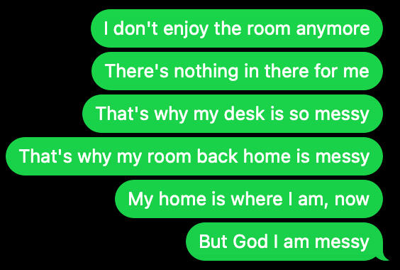 In the room, the blackened has to decide between one hundred guns; they surround him like a lethal audience in an amphitheater. Each one has been used at least once. There are no lights; there is no need for any; the individual can feel their way through the dark. They have never stumbled in their life because their aim is so sure and always perfect, like the truest star. There is nobody in the room except the man, but there are one hundred men inside his mind screaming for release. The screams harmonize with gunfire, explosions, and the opera. The dark then becomes smoke.I took a walk outside. I love you.