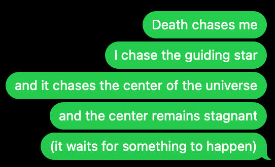 bride runs off, groom self immolated.— she saw his Teethsitting in lotus position, she observed.— Guanyin watches a Movieowl writes horrible song for you.— It was meant for flyingdream crumbles like eggshell, so fragile.— Omelette from a Strange Worldgirl holds star in her hands.— if she drops it we’re deadhungry dog eats sun and moon.— who’s a good boy?