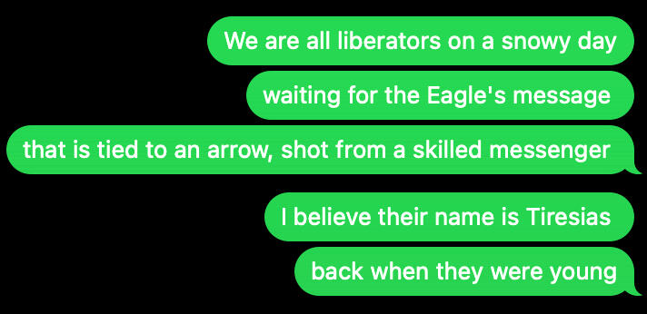Wandering traveler asks owl for directions.Disguised, God replies in forgotten tongue.Traveler responds and makes their way.Owl watches in great anticipation, hoping.Hungry bear rests at path’s end.Wandering traveler asks bear for directions.